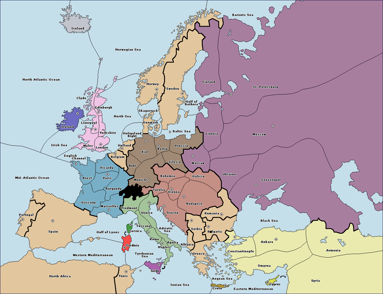 The standard Diplomacy map of Europe with 7 more SCs on islands.